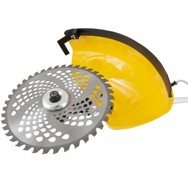 Триммер комплектуется 2 оснастками: режущей леской и пильным диском, они обеспечивают ширину скашивания 25,5 см и 42 см.