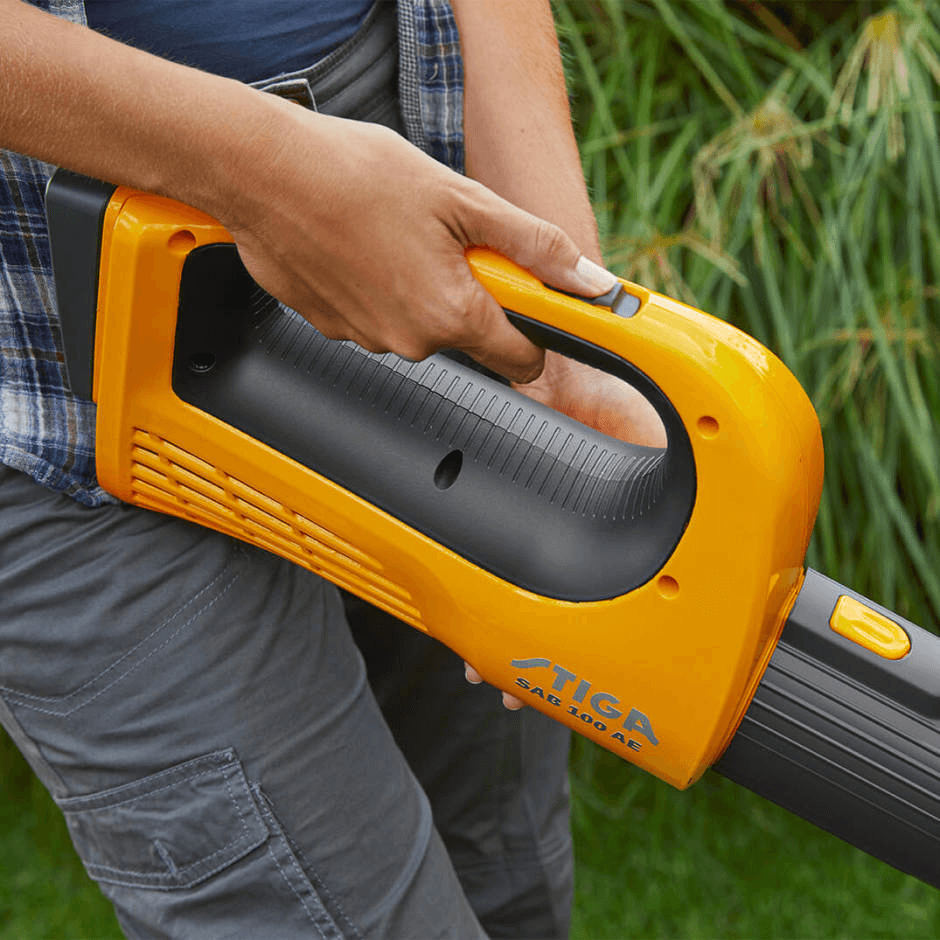 - Питание от аккумулятора: Комплект SAB 100 AE, оснащенный батареей 20 В 4 Ач, мощнее и тише бензиновых воздуходувок, обеспечивая время работы 40 минут при нормальной скорости и 20 минут при повышенной скорости.